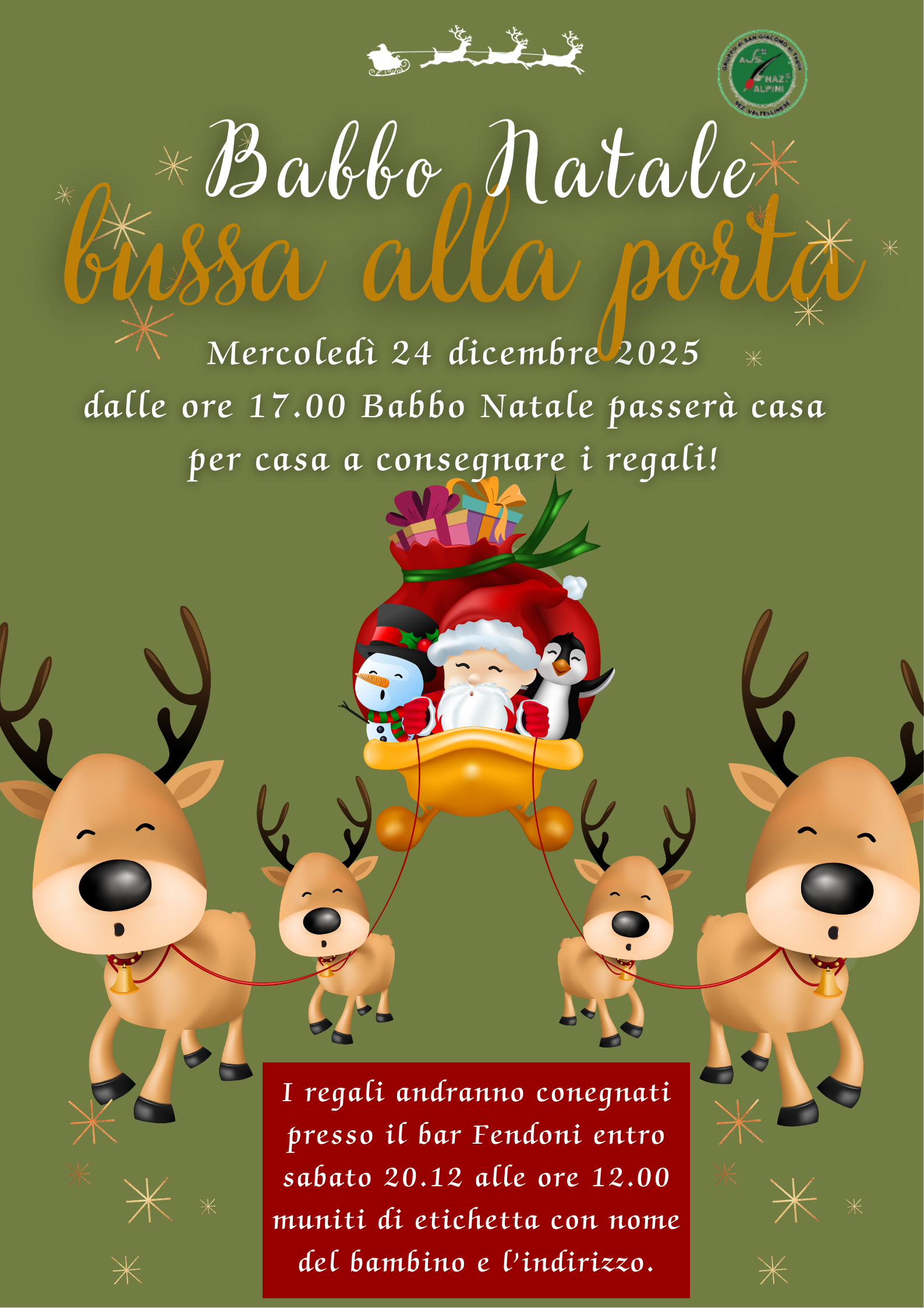 I regali, etichettati con nome e cognome ed indirizzo andranno consegnati entro sabato 20 dicembre al Bar Fendoni.