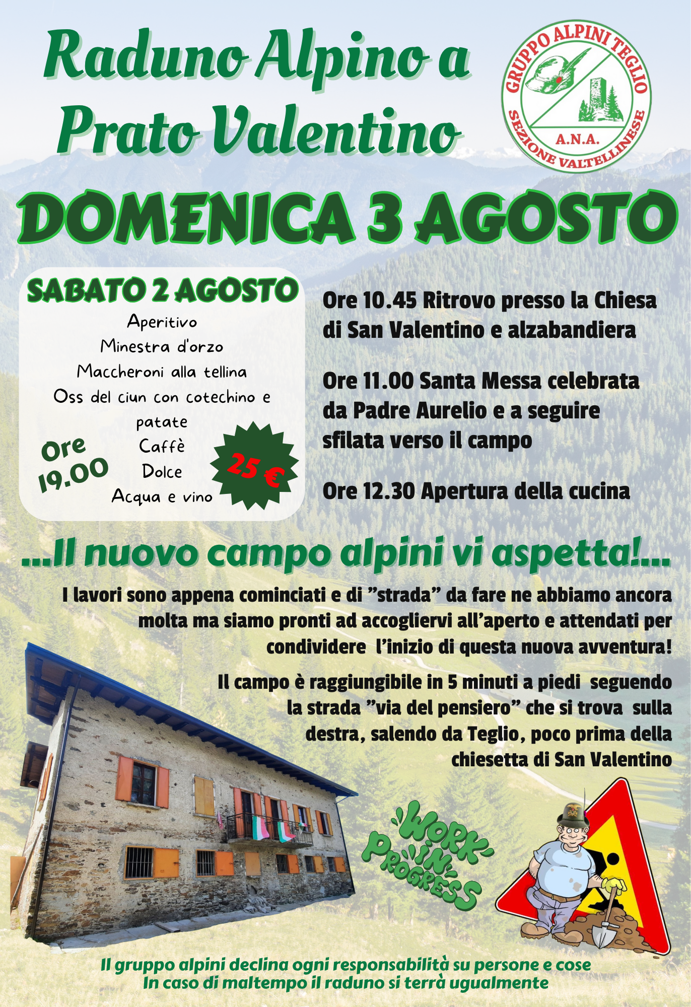 Ore 19.00 - Cena alpina ( aperitivo, minestra d'orzo, maccheroni alla tellina, Oss del ciun con cotechino e patate, caffè, dolce, acqua e vino). Costo 25 euro.