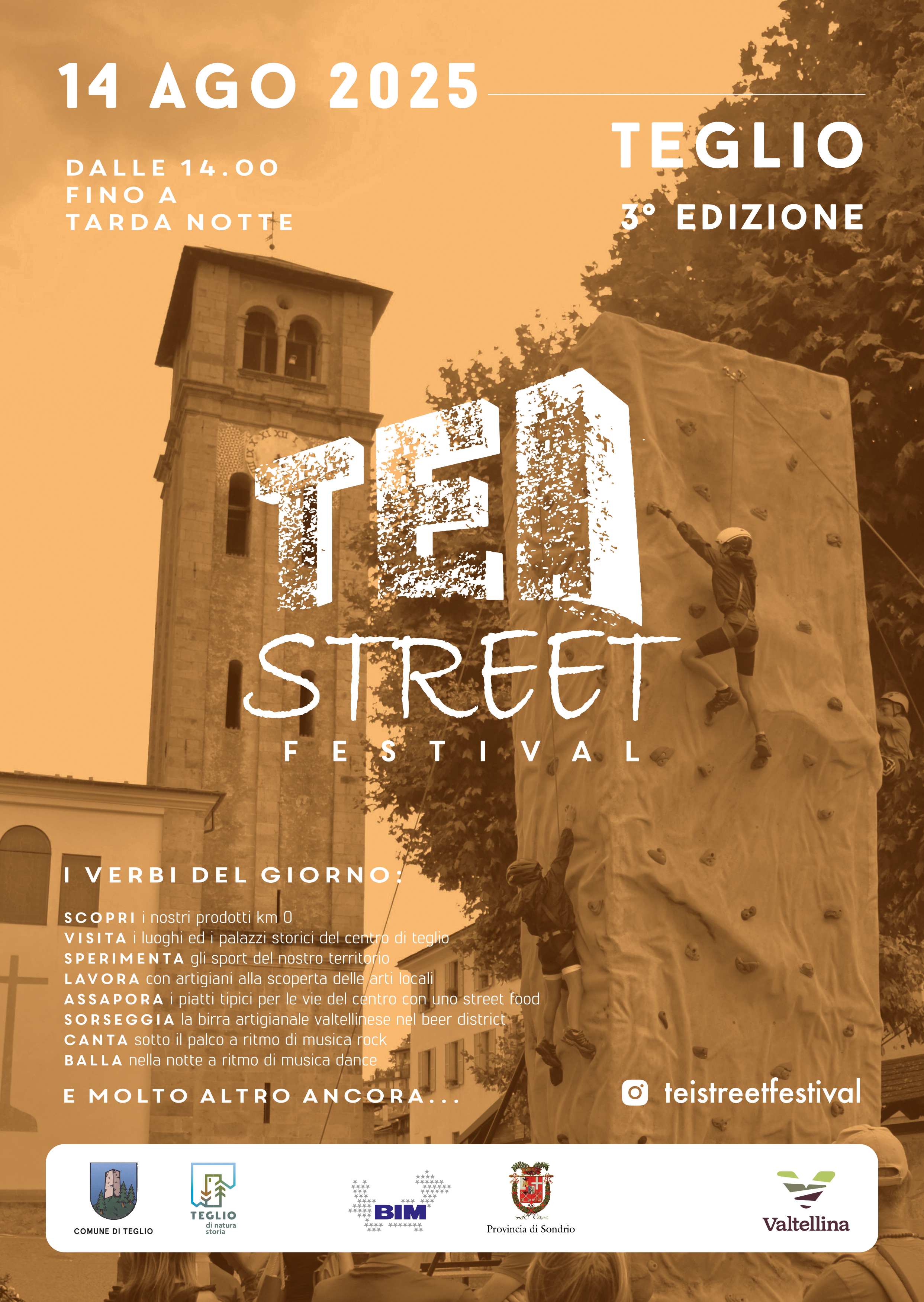 Dalle 14 fino a tarda notte arriva Tei Street Festival, una serie eventi che cattureranno l’attenzione e il divertimento di tutti coloro che saranno a Teglio. Si potranno infatti scoprire tutti i prodotti a chilometro 0, visitare i luoghi e i palazzi storici del centro di Teglio, sperimentare gli sport del territorio, lavorare con gli artigiani alla scoperta delle arti locali, assaporare i piatti tipici per le vie del centro con uno street food, assaggiare la birra artigianale valtellinese nel beer district, cantare al ritmo di musica rock e infine ballare al ritmo della dance.